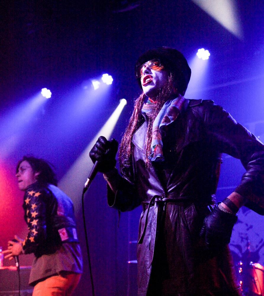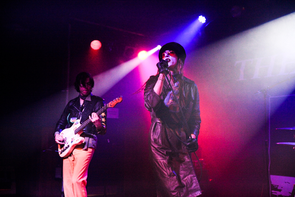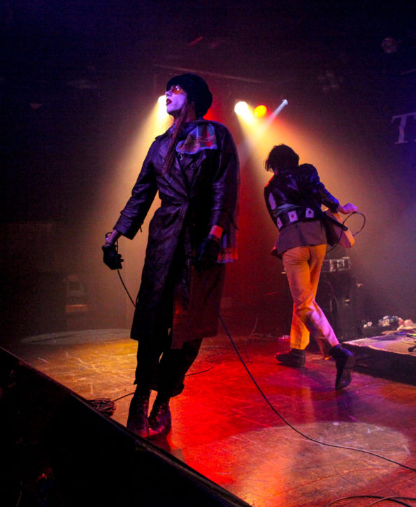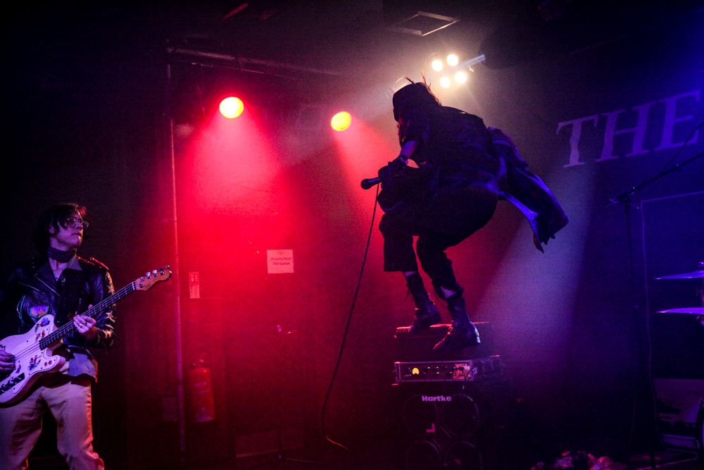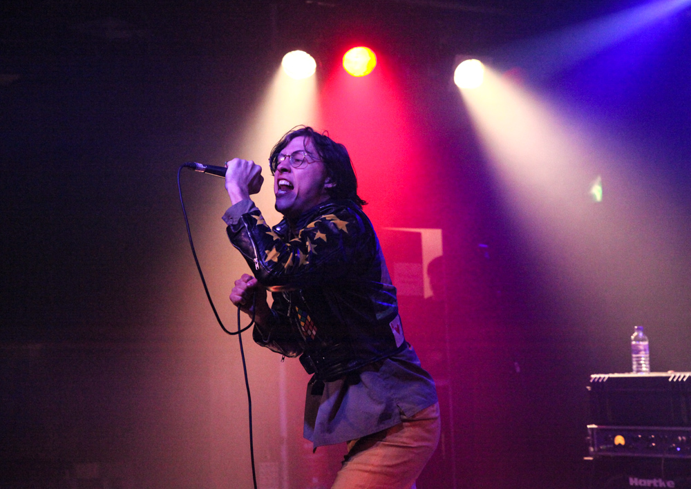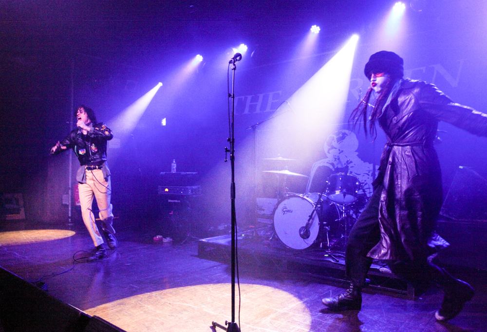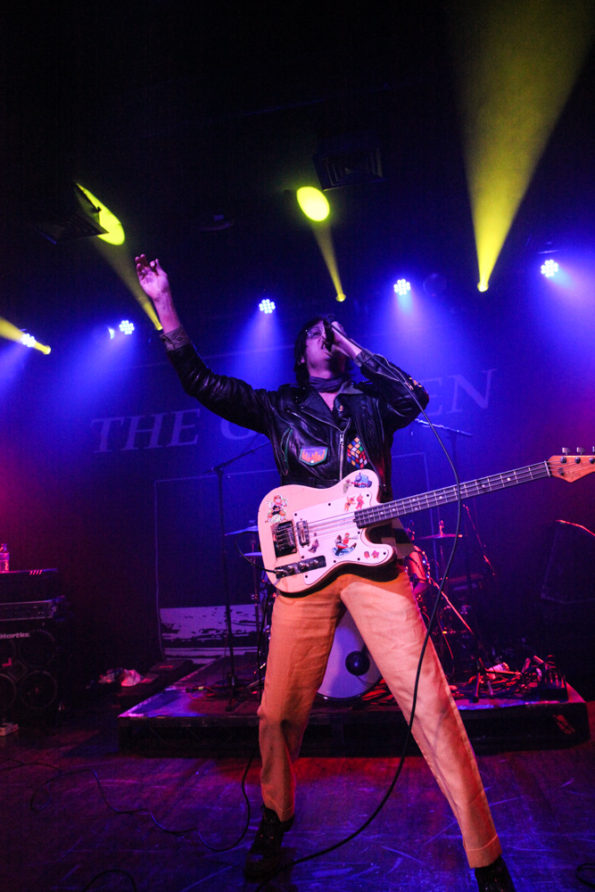 Their look is as out there as their sound. Fletcher dressed up with his face painted white, wearing a black wig and long leather jacket, spending the first half of the gig jumping from one speaker to another like Spider-Man, whilst Wyatt kept to a bit more of a traditional punk rock look wearing yellow flares and black leather jacket. Both giving sinister glances to audience members whilst singing.