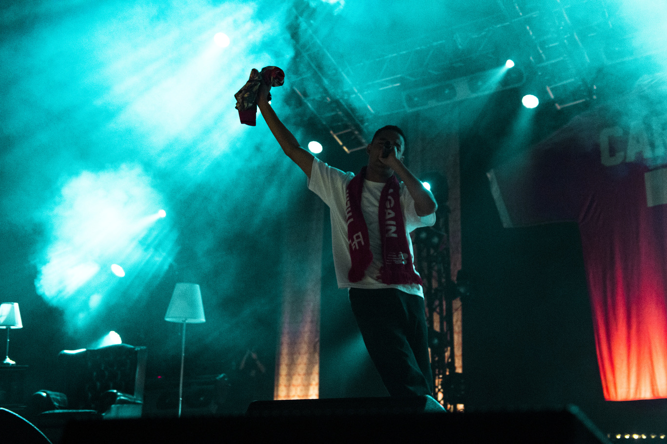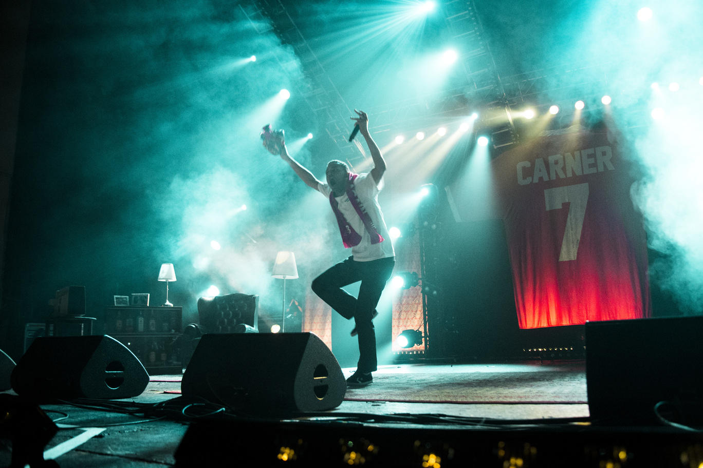 As hordes of eager fans wait impatiently for the gig to begin, the stage is set up to perhaps resemble Carner’s bedroom – a large desk station set up with a Mac, a leafy plant, a lamp and a couple of football trophies; a cabinet complete with multiple bottles of booze including a bottle of Jack Daniels, and beside it a grand leather armchair. An oversized red football shirt with ‘Carner’ on back is used as a back drop. It provides fans with an intimate insight into his life, and gives the show a very personal touch before it’s even begun.