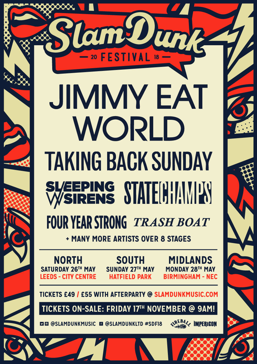 The first announcement is here and it’s massive as the legendary and anthemic Jimmy Eat World will take to the stage in their debut Slam Dunk Festival appearance. They will be joined by emo leaders Taking Back Sunday, party-starters Four Year Strong, post-hardcore heroes Sleeping With Sirens, pop-punk’s hottest property State Champs and fast-rising mob Trash Boat, all of which are poised to deliver the performance of the summer at next year’s unmissable pop-punk party. All six acts will be gracing the Slam Dunk Festival stages as UK festival exclusives.