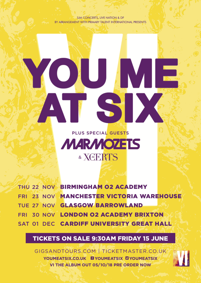 Following the announcement of their brand new album VI, You Me At Six have confirmed they’ll be returning to the road this November/December. With five headline shows planned across the country, the band will stop off in the capital at O2 Academy Brixton on Friday, November 30th, with support coming from Marmozets & The Xcerts.