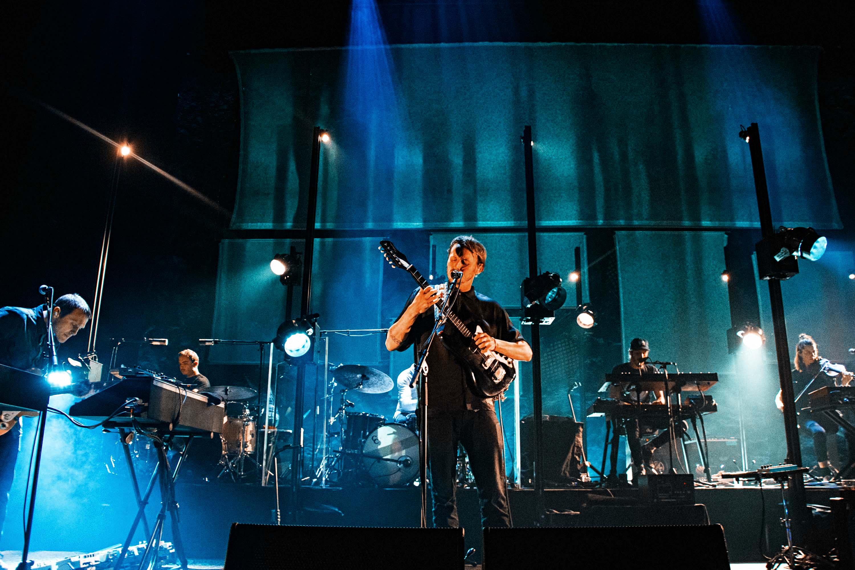 The show is captivating from the first note to the last. Accompanied by his full band, and a glass of wine, Ben takes to the stage to the howling sound of A Boat To An Island On The Wall. Spacious textures and deep electronics quickly set a solemn ambience, before his steady voice aligns with an acoustic guitar. The stage production adds in to the charm as well, with the big screen projecting a distorted swift imagery alongside a rig of subtle lights that synchronise with the vivid pinks and blues that keep flooding the whole stage at times.