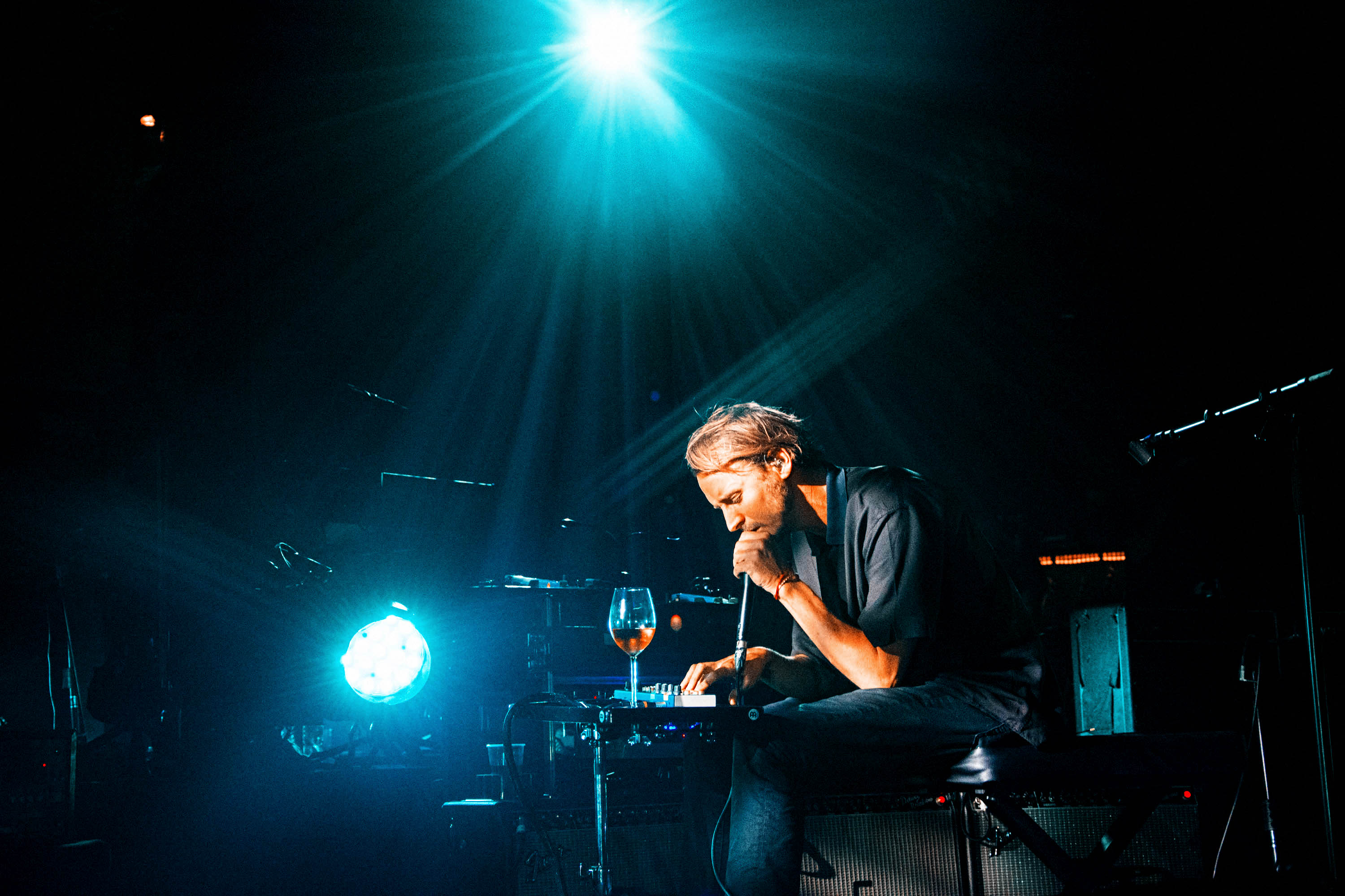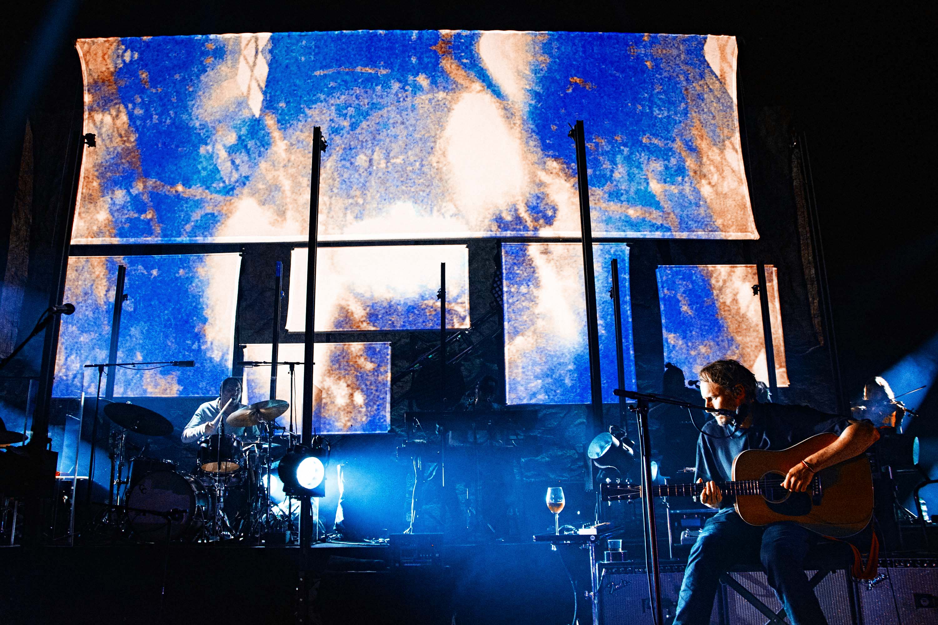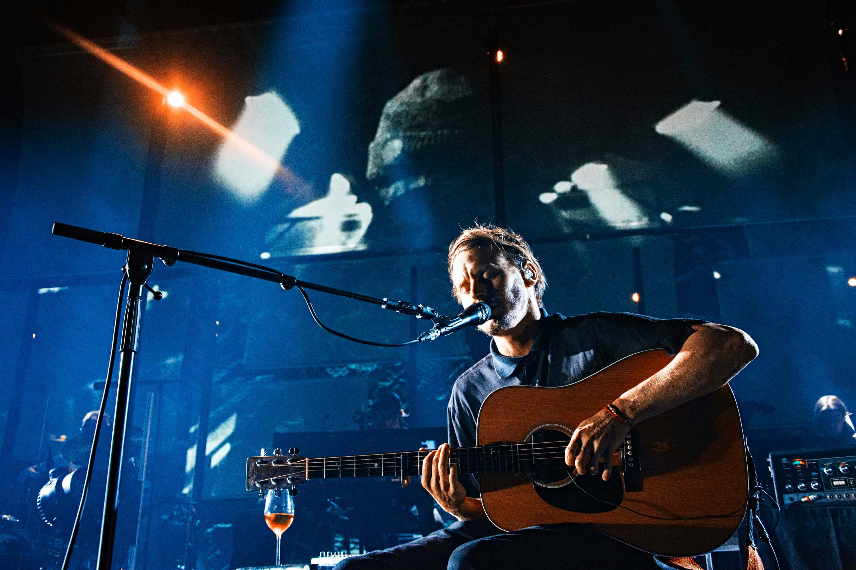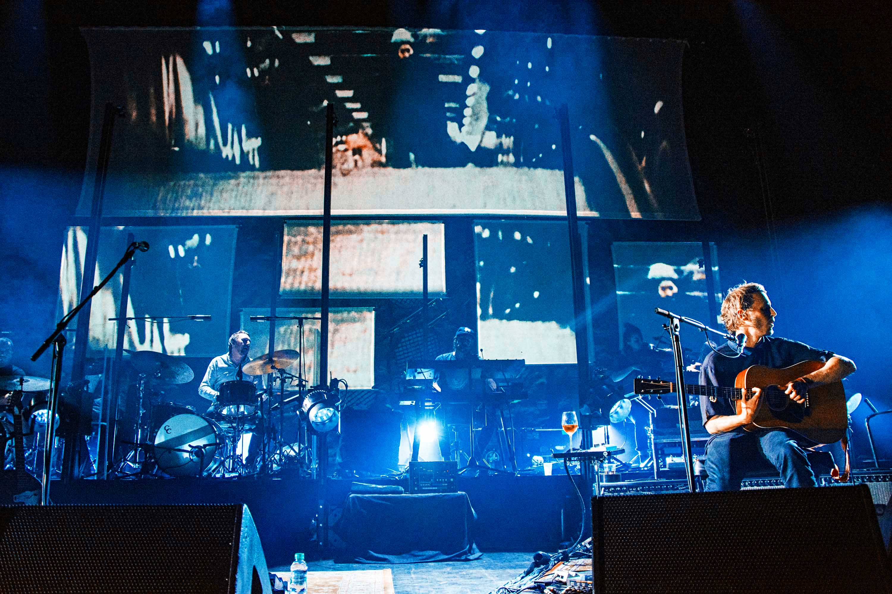 The show is captivating from the first note to the last. Accompanied by his full band, and a glass of wine, Ben takes to the stage to the howling sound of A Boat To An Island On The Wall. Spacious textures and deep electronics quickly set a solemn ambience, before his steady voice aligns with an acoustic guitar. The stage production adds in to the charm as well, with the big screen projecting a distorted swift imagery alongside a rig of subtle lights that synchronise with the vivid pinks and blues that keep flooding the whole stage at times.