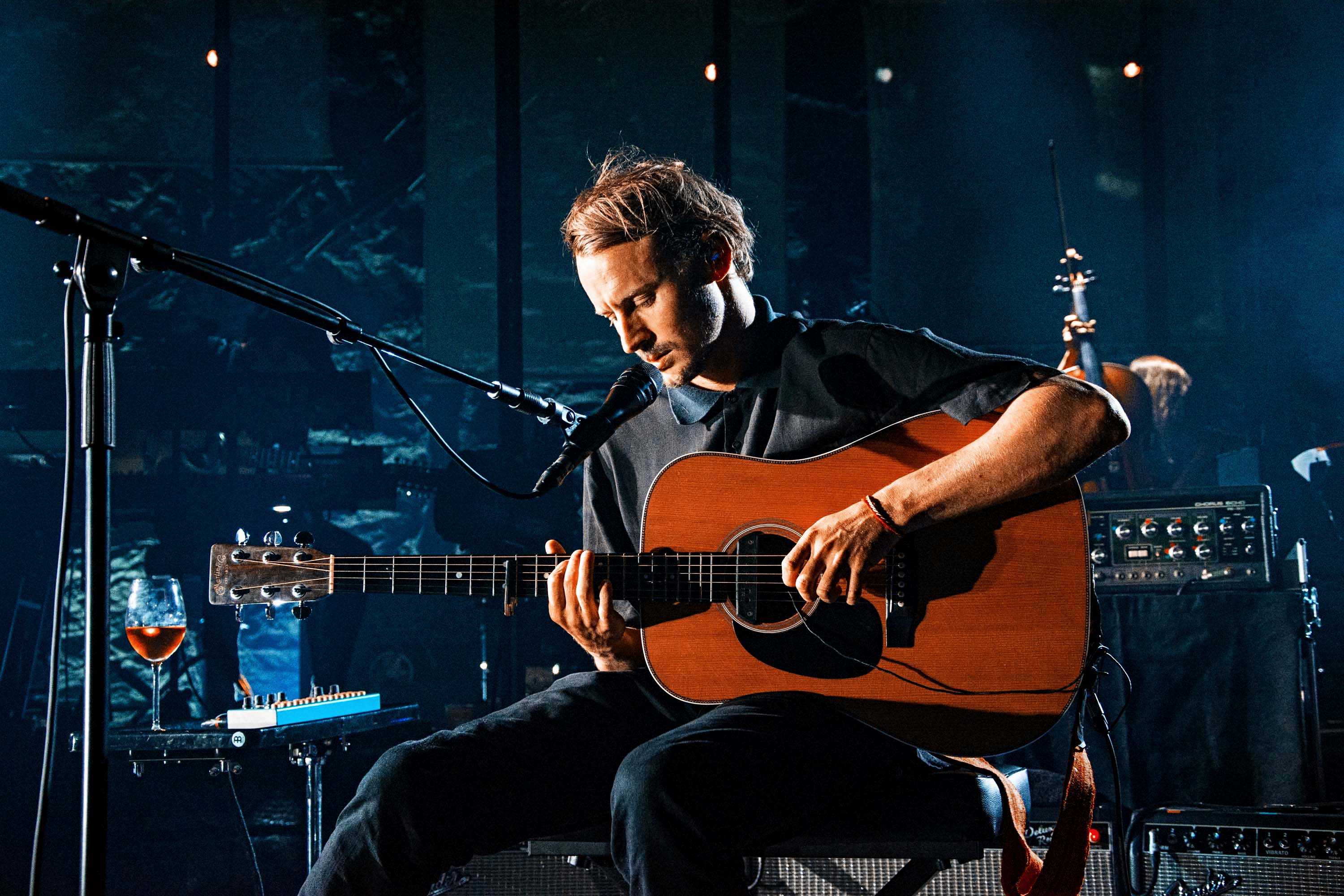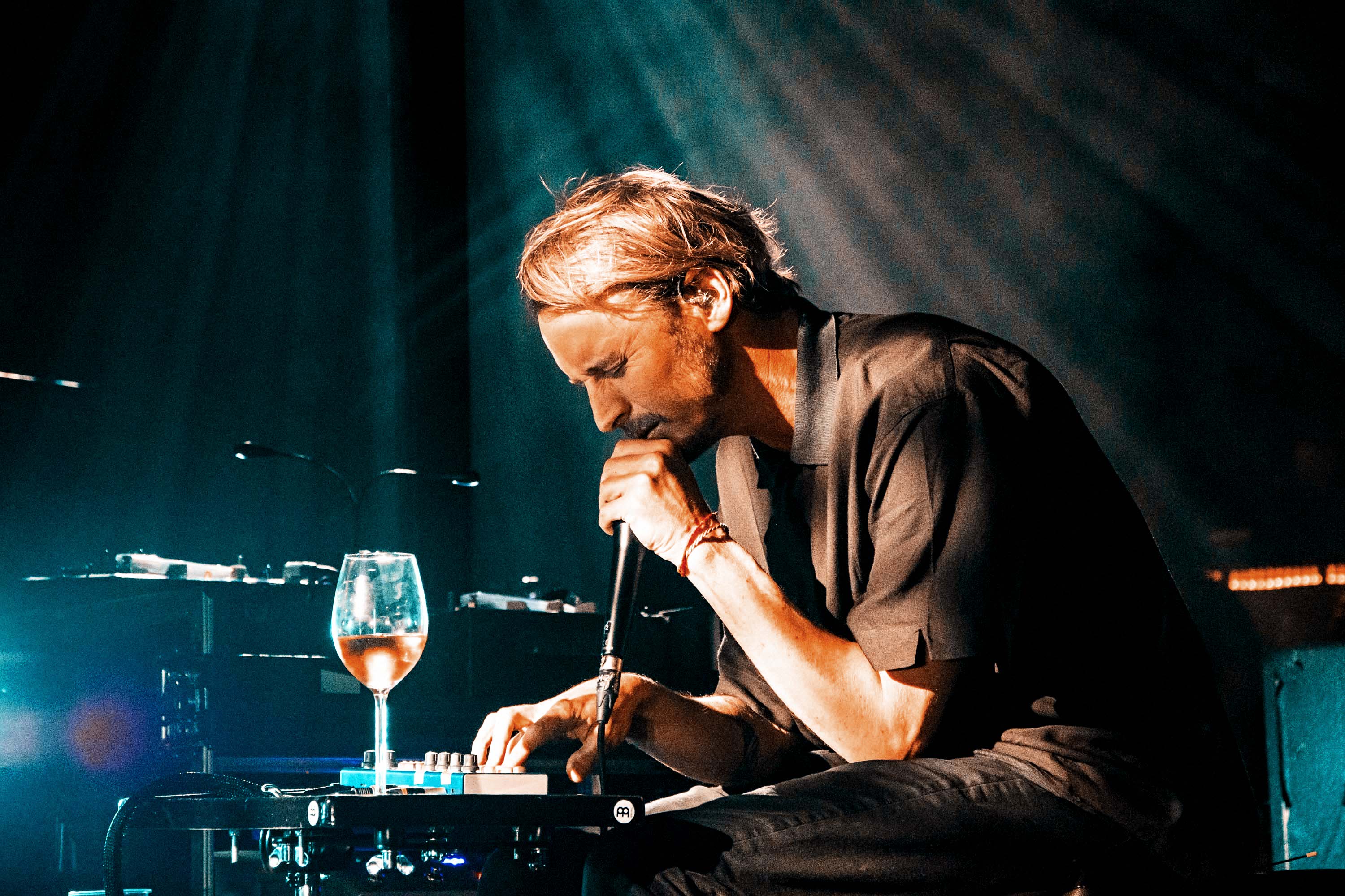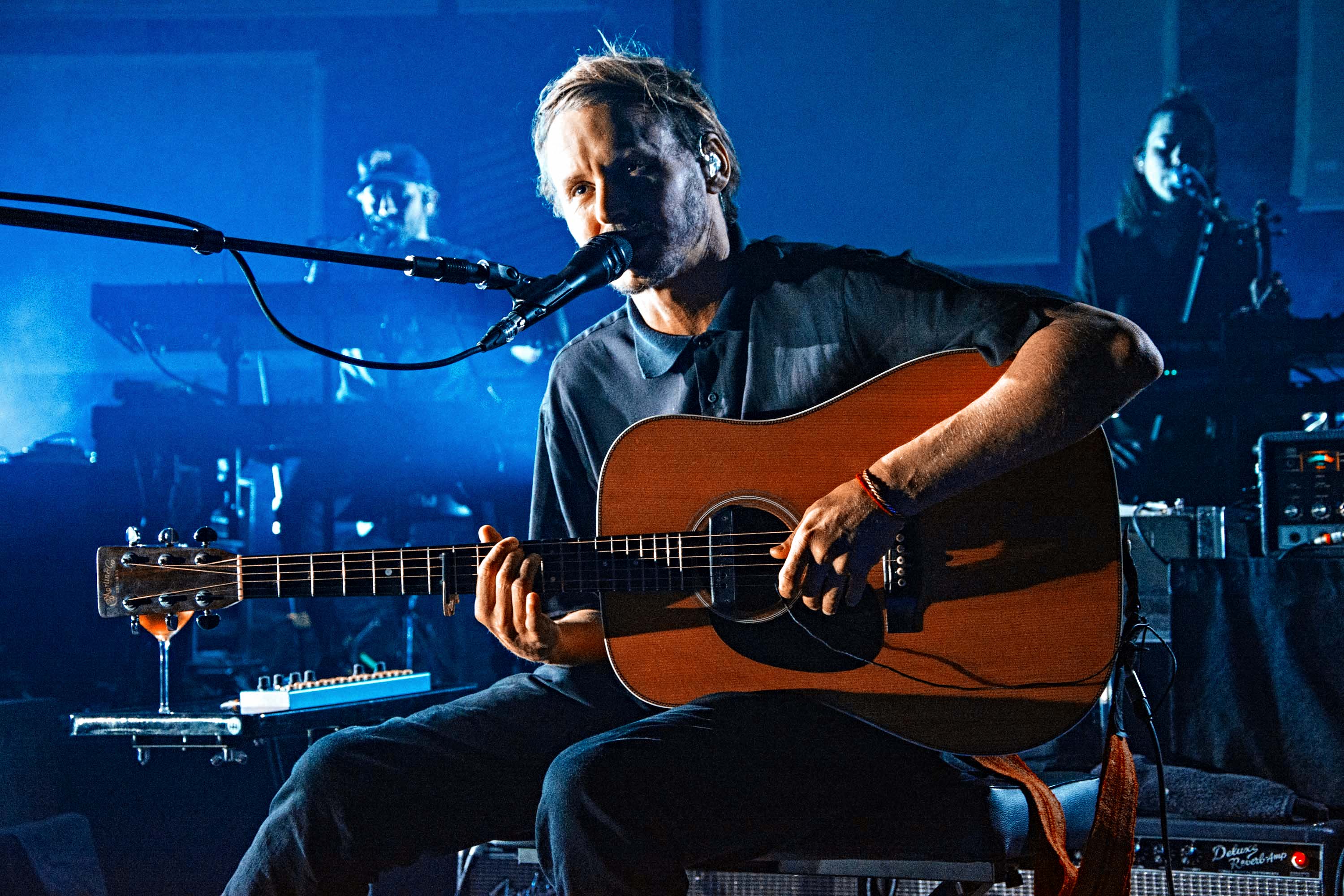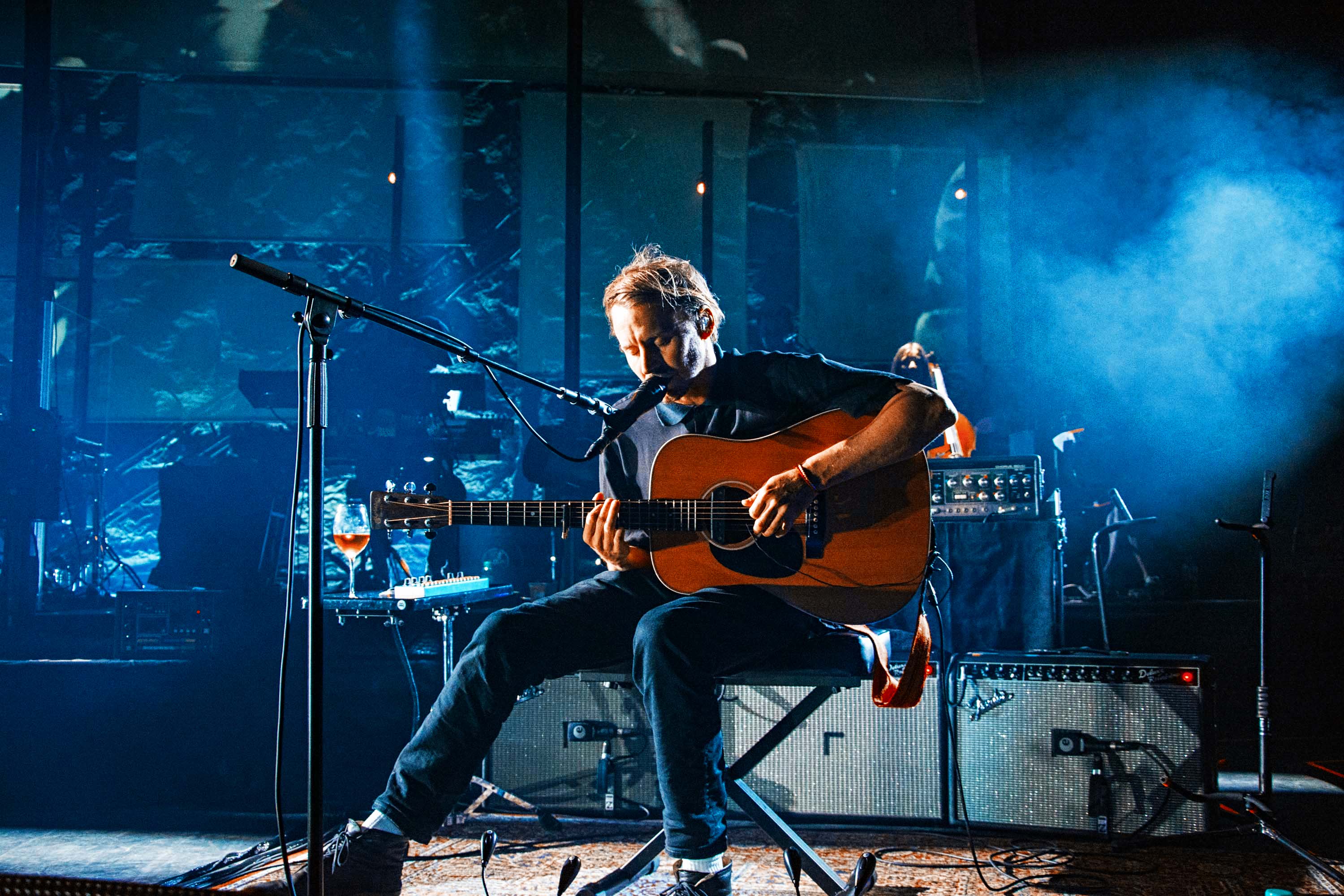 The show is captivating from the first note to the last. Accompanied by his full band, and a glass of wine, Ben takes to the stage to the howling sound of A Boat To An Island On The Wall. Spacious textures and deep electronics quickly set a solemn ambience, before his steady voice aligns with an acoustic guitar. The stage production adds in to the charm as well, with the big screen projecting a distorted swift imagery alongside a rig of subtle lights that synchronise with the vivid pinks and blues that keep flooding the whole stage at times.
