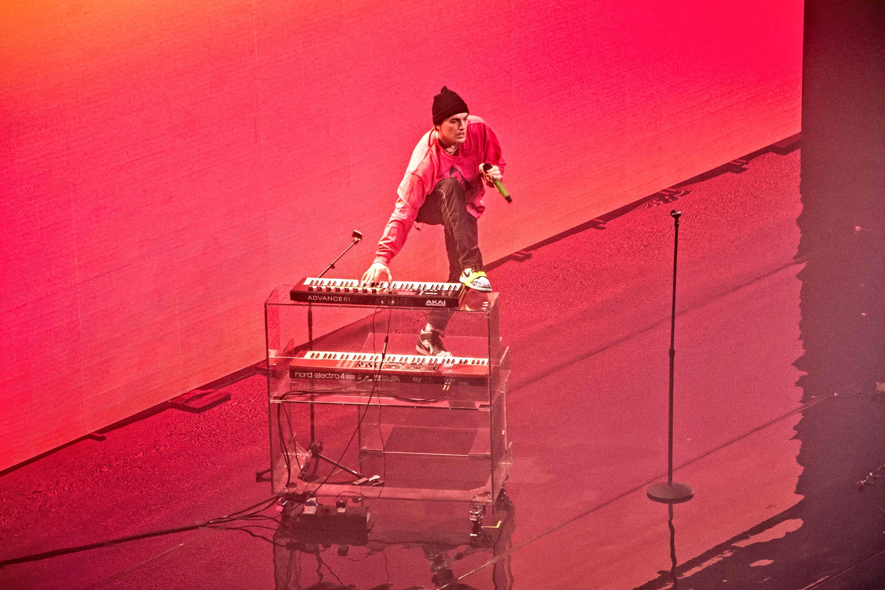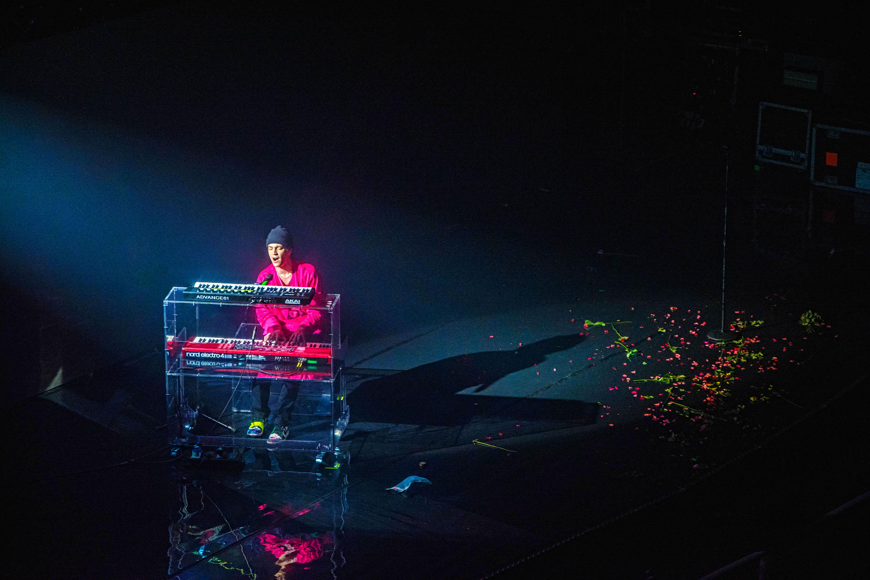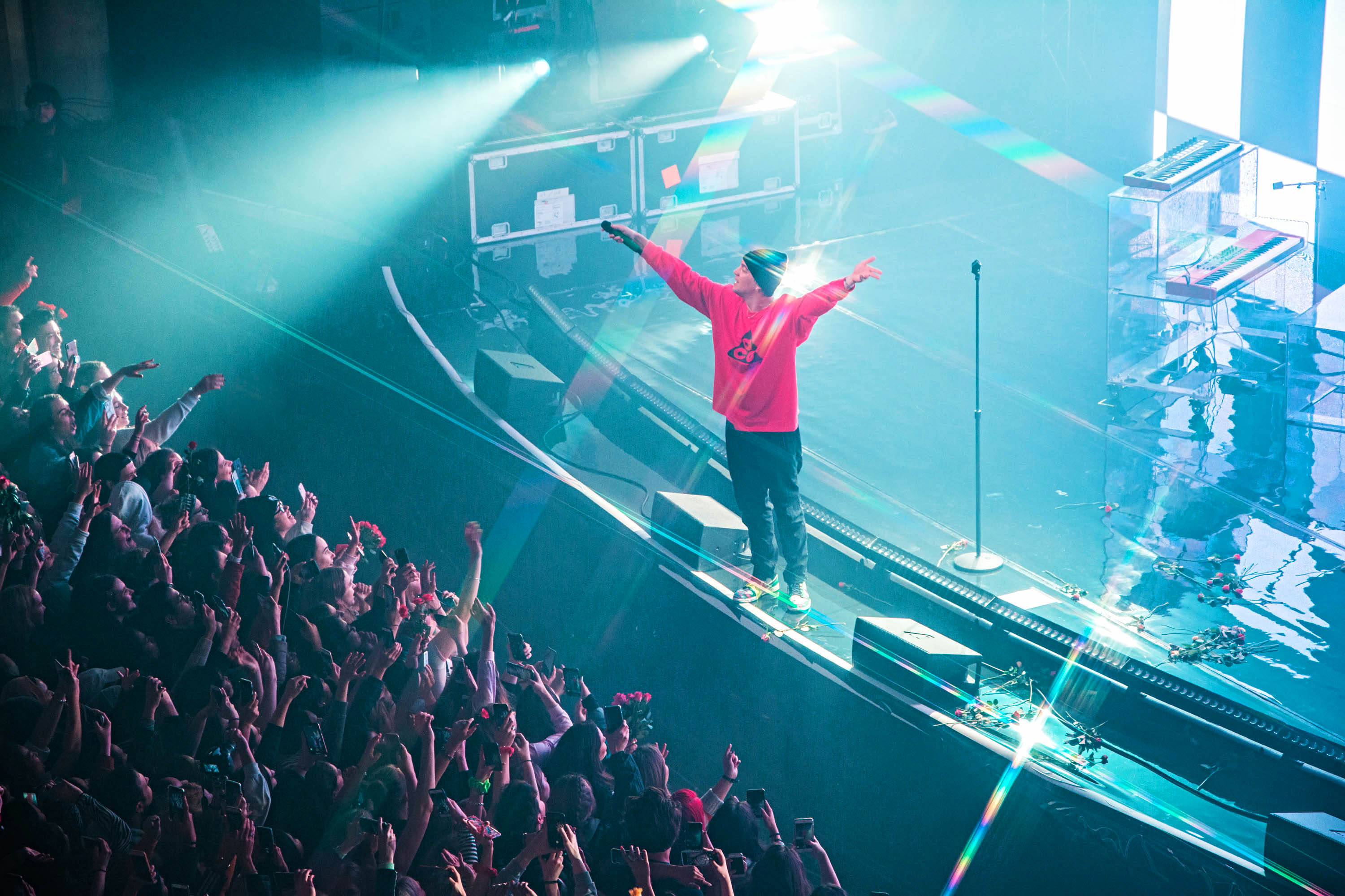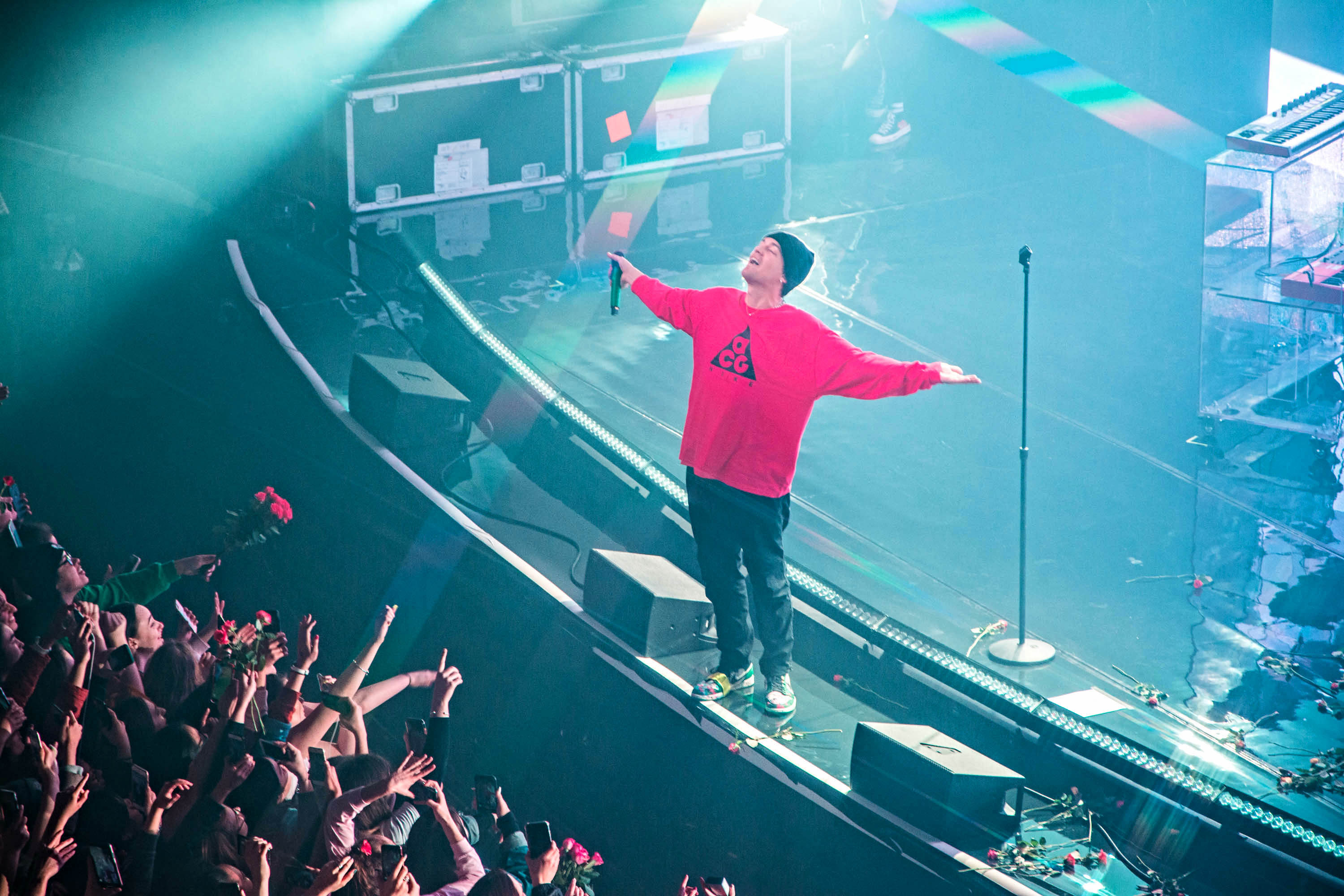 Taking the stage design to the next level, the mirroring floor and glassy piano made quite a pairing with the dazzling lighting patterns and flickering imagery projected on a massive two-level stage platform. With red roses flying towards the band from the very first note – a nod to the previous album cycle – the feeling of nostalgia pierced right through, emphasising LANY’s aesthetics once more.