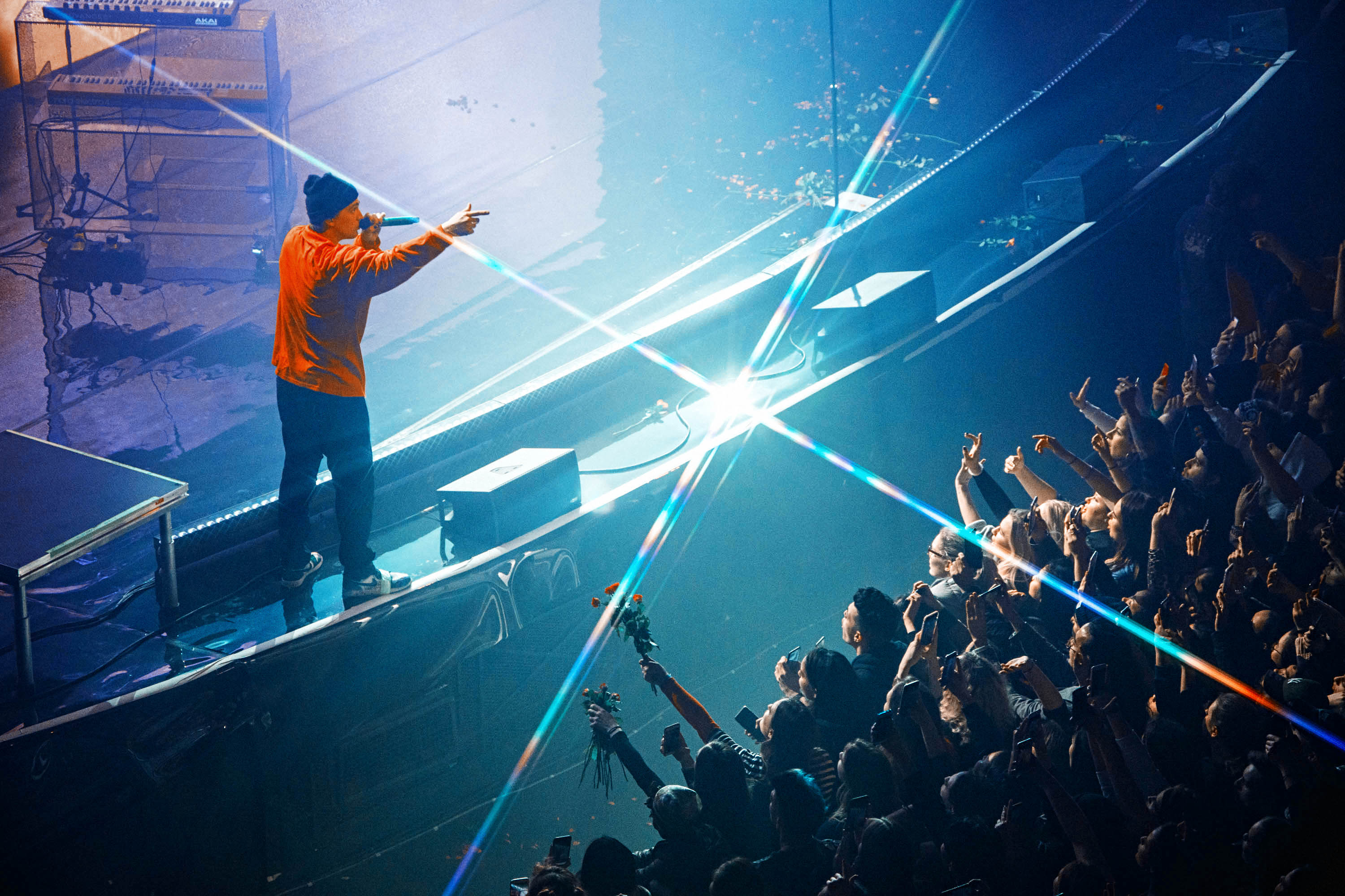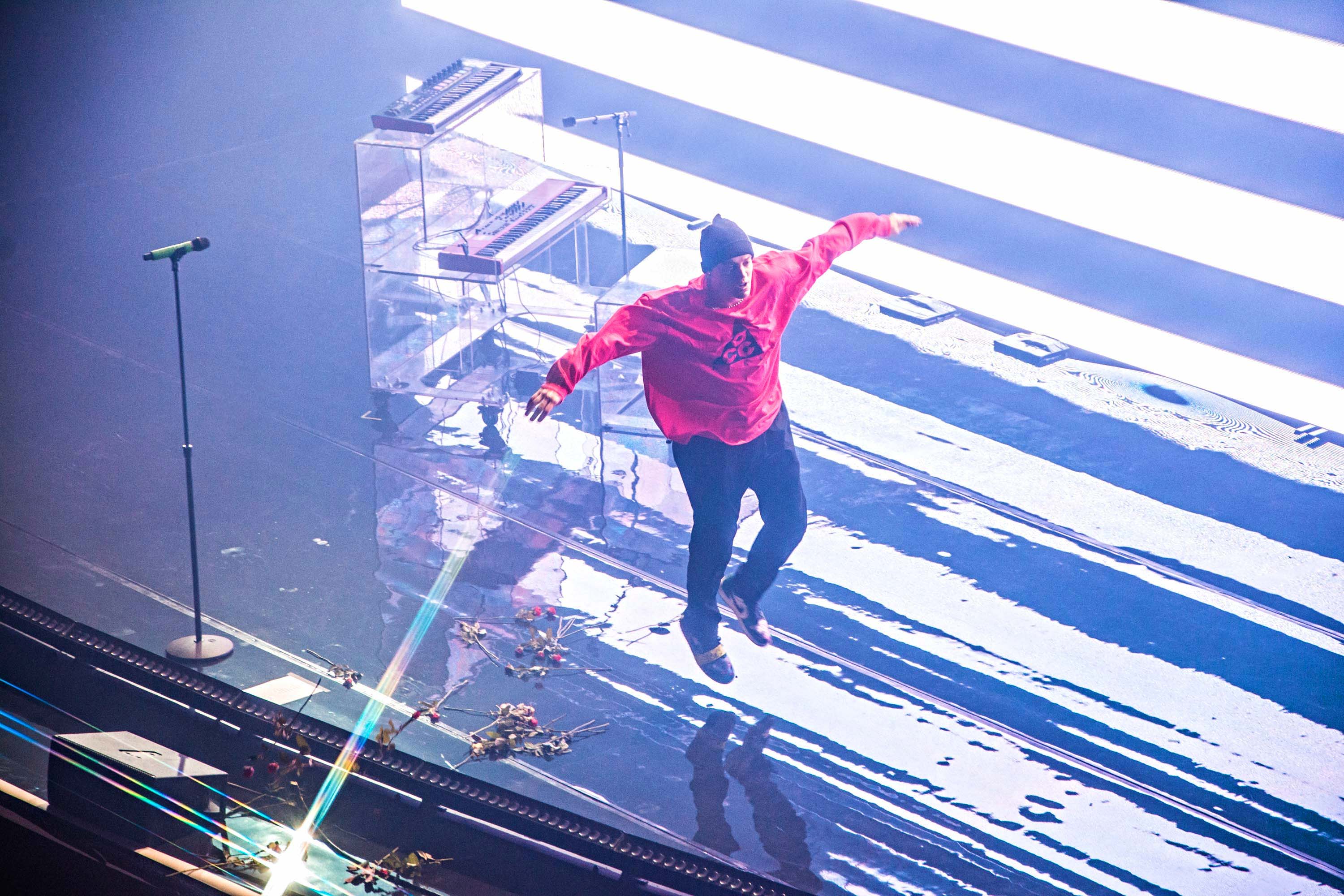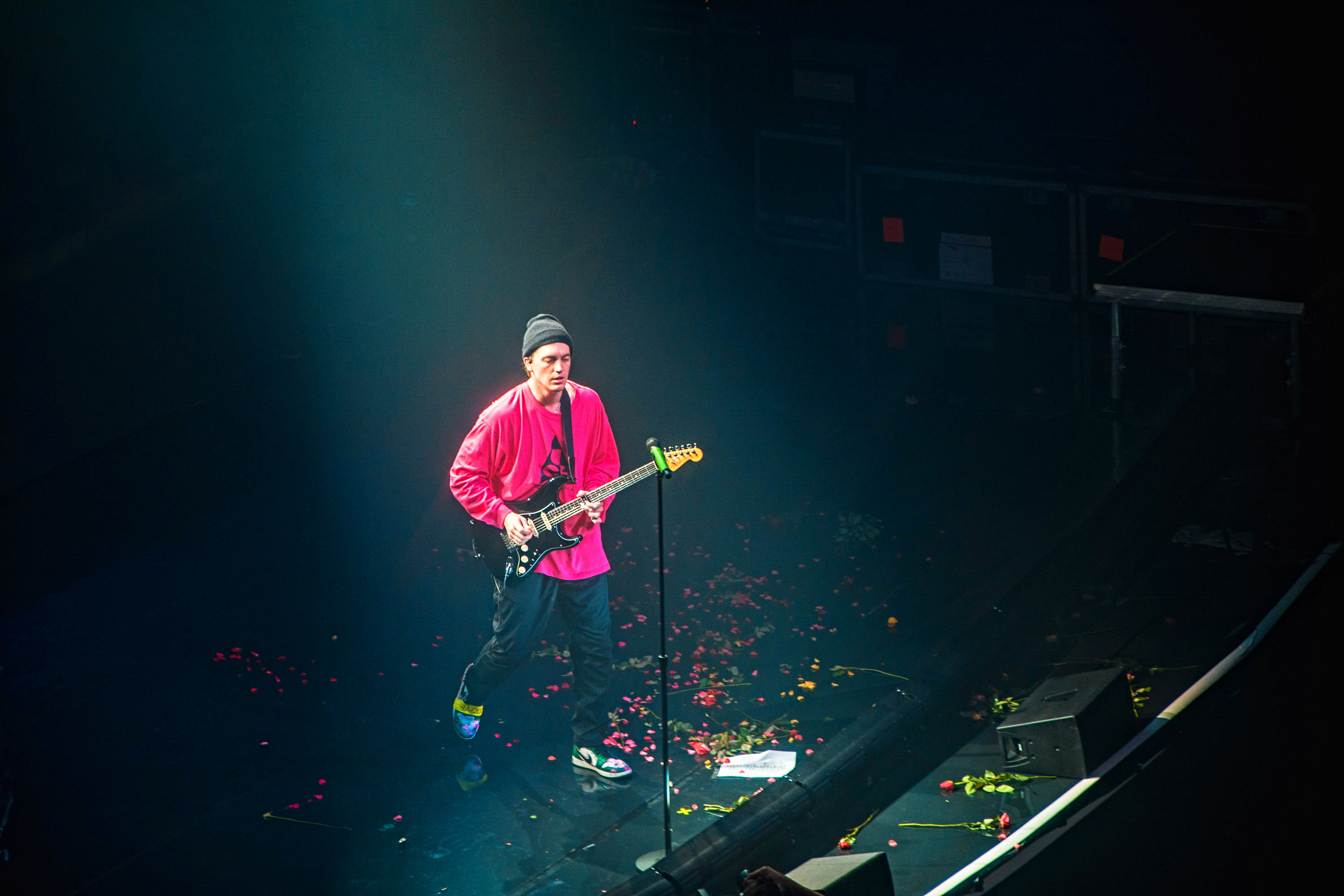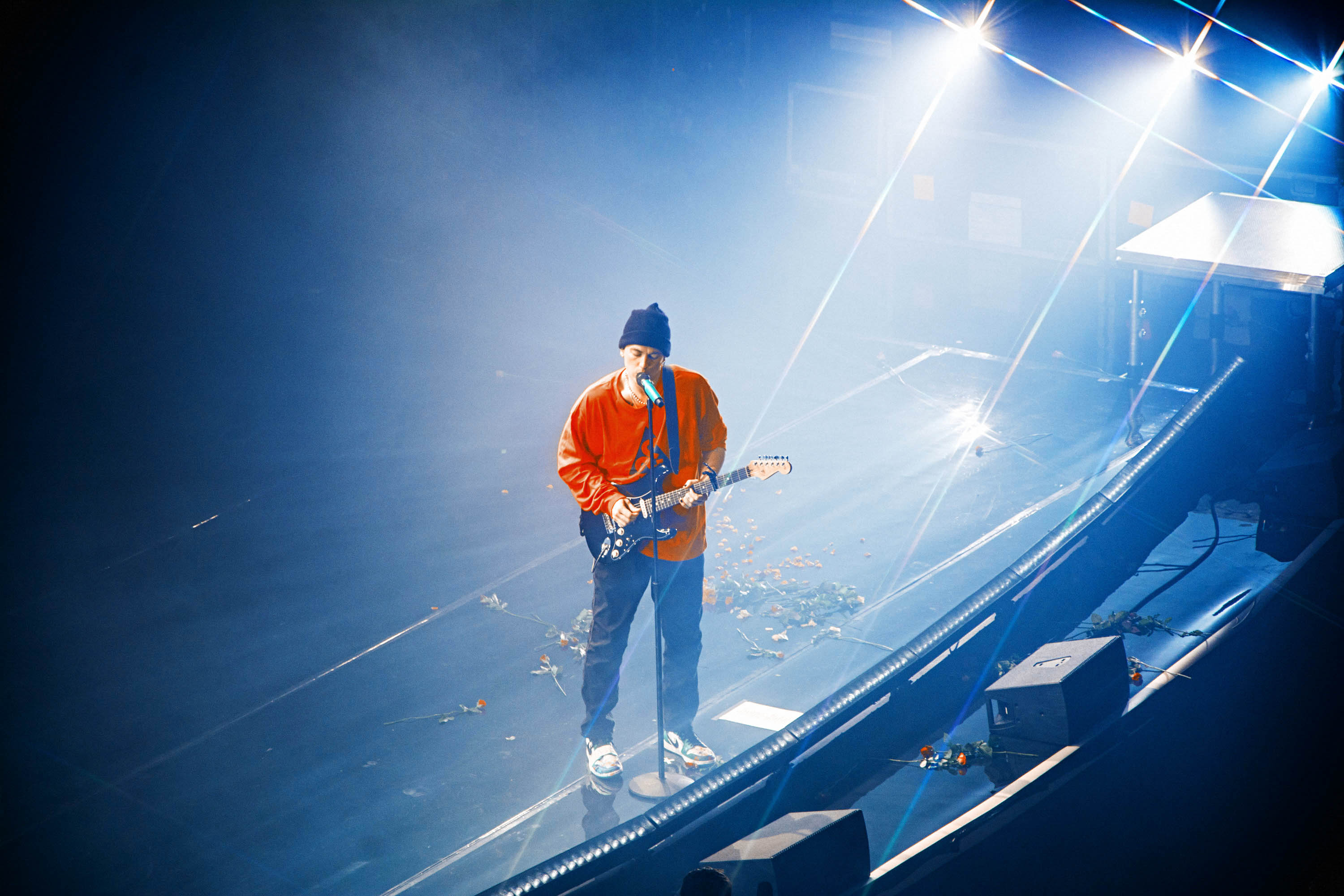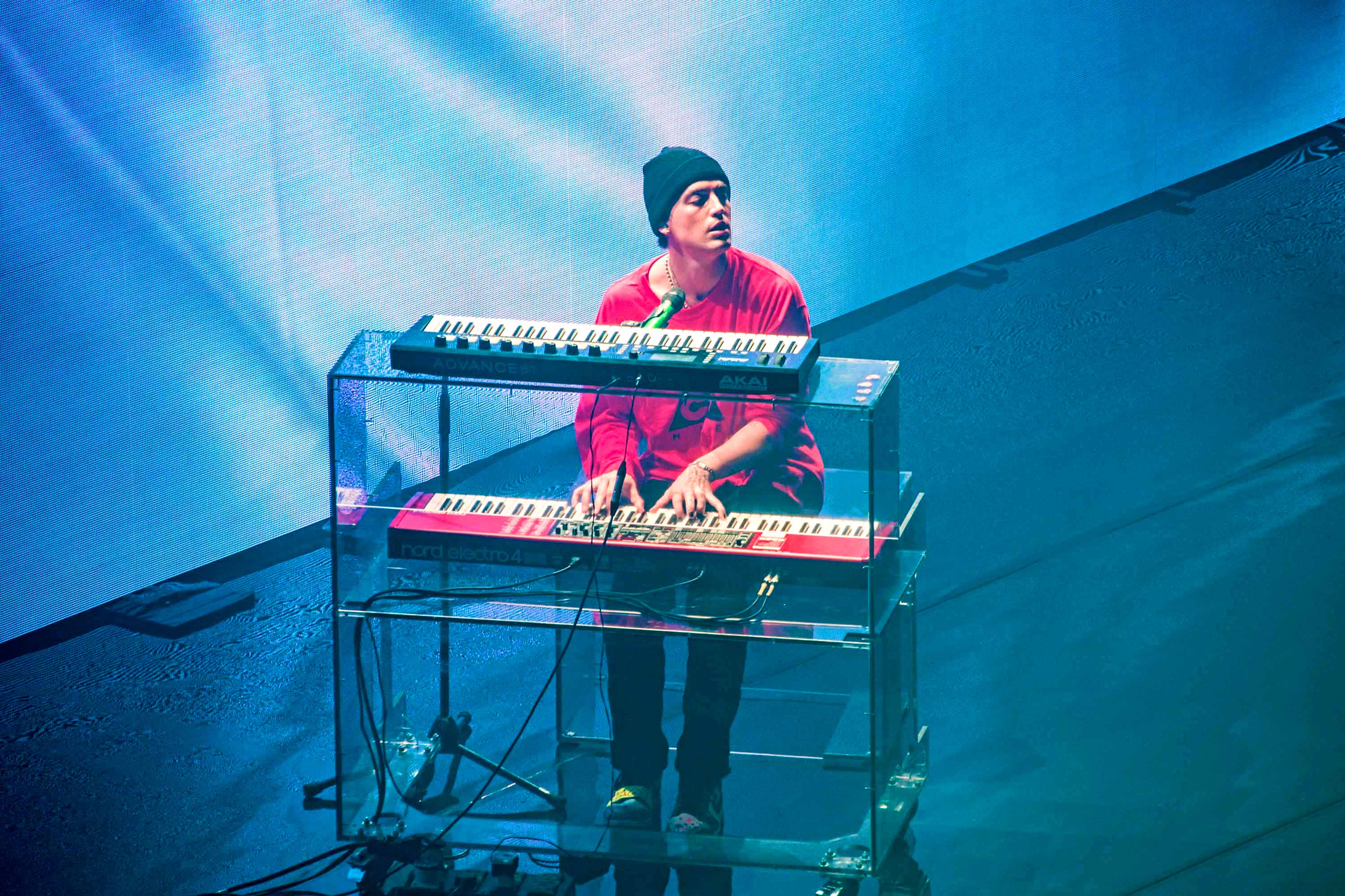 Taking the stage design to the next level, the mirroring floor and glassy piano made quite a pairing with the dazzling lighting patterns and flickering imagery projected on a massive two-level stage platform. With red roses flying towards the band from the very first note – a nod to the previous album cycle – the feeling of nostalgia pierced right through, emphasising LANY’s aesthetics once more.